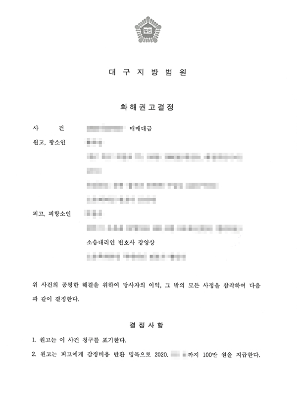 고려법률사무소(담당 변호사 : 강영상)는 피고인 광주광역시 소재 A씨를 대리하여, 피고에게 피고의 배우자였던 B씨(망인)가 토지매매 시 계약되었던 금액을 지급하지 않았다는 대구광역시 소재 C씨의 원고가 제기하였던 토지매매대금 잔급 지급 불이행 소송에서 피고측의 사정을 대변하여 참작하게 도움을 준 결과. 원고의 청구를 포기하게 만들었고 원고에게 감정비용 반환 명목으로 100만원의 위자료를 받아내는 소송방어에 성공한 결과를 판결 받게 되었습니다.