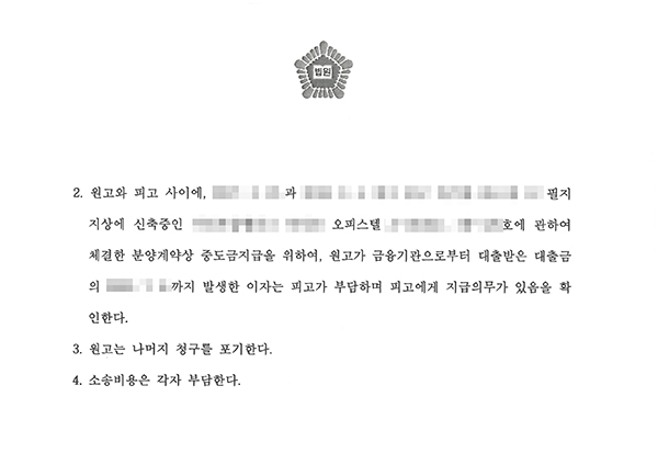 고려법률사무소(담당 변호사 : 강영상)는 원고인 경상남도 소재 A씨를 대리하여, 원고에게 신축 오피스텔과 상가를 분양한 건설업체 대표 B씨를 피고로 하여 분양계약을 불이행하여 분약계약 해지 및 그에 따른 분양대금을 원상회복하고 위약금 등의 손해배상을 청구하였고 승소하여 피고는 원고에게 받은 계약금과 중도금, 중도금 대출금에 대한 이자 등을 전액 반환하라는 판결을 받아냈습니다.