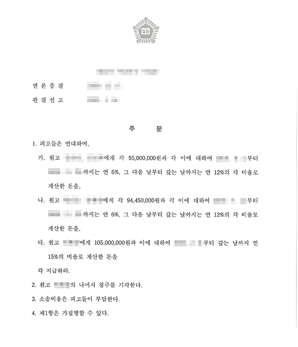 고려법률사무소(담당변호사 : 강영상)는 원고인 강원도 소재 A씨, B씨와 경기도 소재 C씨, D씨, E씨 등 5인을 대리하여 원고와 태양광 발전소 설치 및 계약한 G씨가 운영하는 태양광 설비시설업체와 관련된 법인업체를 피고로 하여 피고와 원고가 태양광 발전소 설치 및 공사를 지체하고 이행불능하여 발생된 내용을 기반으로 분양계약 시 예정되었던 결과와는 다른 정당한 이유 없이 공사를 지연하고 이행지체 한 이유를 대변하며 분양계약 원상회복 및 손해배상을 청구하였고 승소하여 피고는 원고에게 받은 태양광 공사 관련 대금 전부를 반환하라는 판결을 받아냈습니다.