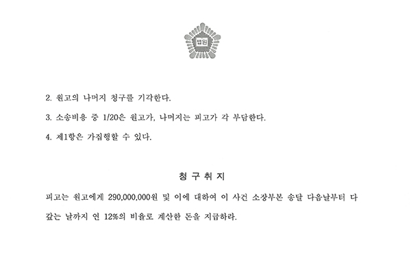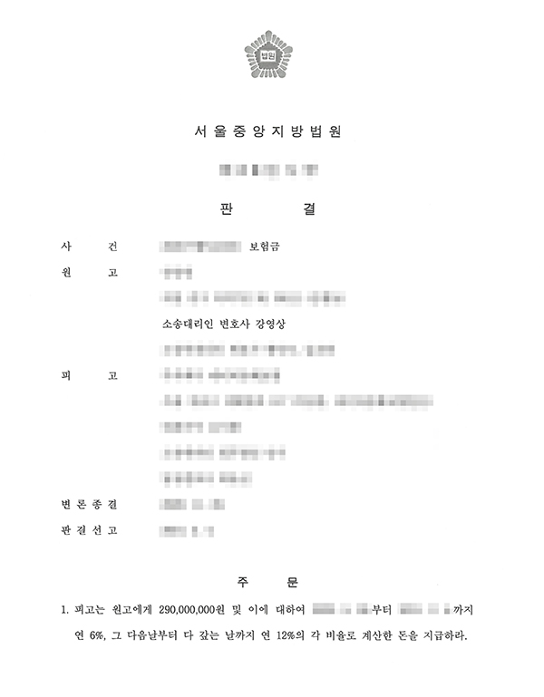 고려법률사무소(담당 변호사 : 강영상)는 원고인 교통사고 상해로 망인이 된 피보험자 법정상속인 A씨를 대리하여 원고측의 피보험자 망인이 사고 당시 고의성을 가지고 교통사고를 유발하였다는 보험사 B를 피고로 하여 원고에게 지연손해금 및 보험계약에 의한 사망보험금 청구소송을 제기하였고 교통사고 당시의 상황을 적극적으로 대변하여 승소하여 원고의 청구를 그대로 인정 받아내는 판결을 받아냈습니다.