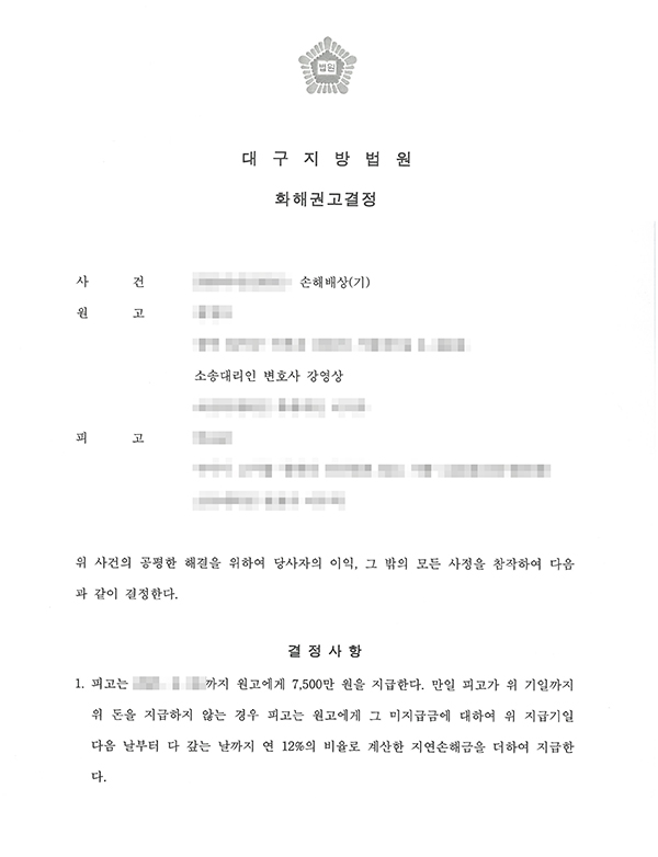고려법률사무소(담당 변호사 : 강영상)는 원고인 대구 소재 A씨를 대리하여 원고를 상대로 함께 음주한 자리에서 원고를 무차별적으로 특수폭행하여 상해를 입힌 B씨를 피고로 하여 형사책임 외에 민사상의 책임을 따지기 위해 원고 A씨에게 발생된 향후 치료비와 행위에 따른 위자료, 노동능력 상실에 대한 손해배상을 청구하여 피고는 원고에게 7,500만원에 대한 손해금 및 위자료를 배상하라는 판결을 받아냈습니다.