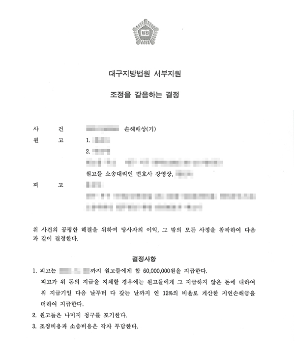 고려법률사무소(담당 변호사 : 강영상]는 원고인 대구소재 A씨, B씨를 대리하여 원고들의 현금자산을 횡령한 원고의 자녀 C씨를 피고로 하여 피고는 십여년간 원고에게서 자금관리를 명분으로 수천만원의 현금자산을 편취하고 기망한 상황에 대해서 손해배상의 책임을 물어 소송을 진행하였고 재판과정에서 가족사이 협의를 진행하여 조정의 결과를 받아냈습니다.