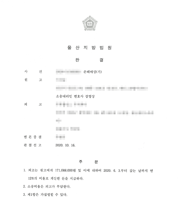 고려법률사무소(담당 변호사 : 강영상)는 원고인 경상남도 소재 A씨를 대리하여, 원고에게 고층 오피스텔을 사전분양한다며 공고한 건설업체 대표 B씨를 피고로 하여 분양계약에 맞지 않는 입주기간 지연으로 계약금과 분양대금, 분양대금의 위약금 등 전액 반환(손해배상)을 청구하였고 승소하여 피고는 원고에게 받은 계약금과 분양대금과 함께 분양대금의 위약금을 포함한 전액을 반환하라는 판결을 받았습니다.