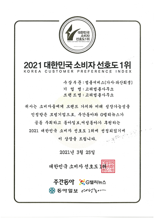 [2021 대한민국 소비자선호도 1위] 가사‧파산회생 법률서비스, 고려법률사무소